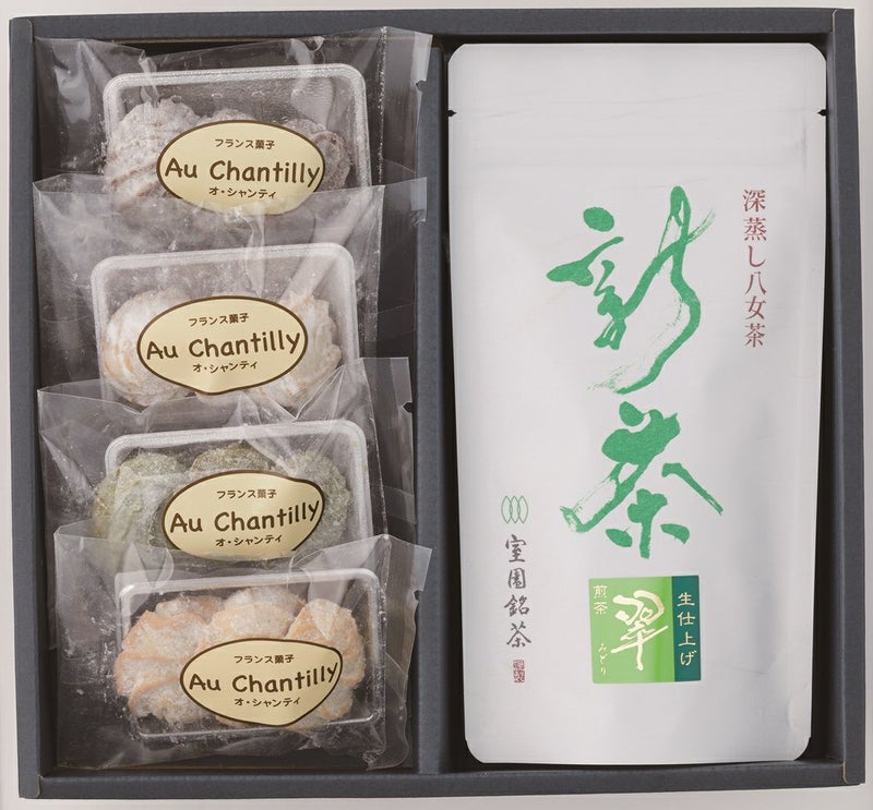 新茶らしさを生かした期間限定商品「翠生仕上げ」と八女市のフランス菓子店 オ・シャンティーの「コンキーユ」の詰め合わせです。